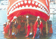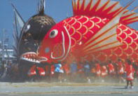 この祭の撮りどころは、鯛がズラリと結集した時、激突する場面、ユッサユッサと町を練り歩く時、そして海中遊泳と、4シーンが挙げられます。いずれも魅力的な被写体になります。このシーンから、鯛の大きさを強調するのに便利なワイドレンズ、遊泳では望遠レンズが必要になります。