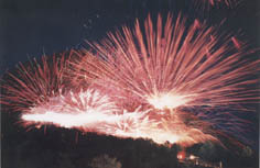 花火大会といいますと、一般的には川、海、湖など水辺がほとんどですが、昭和新山の「噴火の再現」をうたっていますから、ここは頂上近い山の中腹に花火が仕掛けられています。午後8時過ぎから約2000発の花火が打ち上げられ、辺りは大音響に包まれて、本当に噴火しているように見えます。打上げ花火が時として、ほぼ頭上で花火がドーンと開きますので迫力満点です。