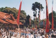祭の当日は、午前8時頃から、町内の各集落に鎮座する19末社の神輿が本社に参集して祭典が行われます。末社からくりだした神輿は、天狗面の猿田彦の先導で、高さ20メートルもの真紅の大枠旗や伽衆などを従え、「イヤサカサーッ」の掛け声や鉦(かね)・太鼓の音も賑やかに本社を目指します。