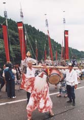 祭の幕が近づく夕方になると、金色に輝く20台の神輿と20数本の真紅の大枠旗が夕日に映えて、まさに一大絵巻のようです。