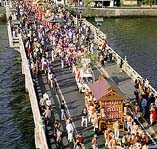 正午に城山をスタートして、夕方まで市内を練り歩きます。ハッピ姿の子供たち数十人が鼕台をひき、威勢のいい若者たちがバチさばきも鮮やかに鼕をたたきながら、ドーンドーンと、市中に鳴り響かせます。松江の人達は、この鼕行列を終えると、紅葉が始まり、冬支度にかかるそうで、山陰の秋を彩る伝統行事として親しみもって迎えられています。