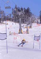 大回転では標高945mから標高差250m、全長1000mを超えるロングコースを一気に駆け抜けます。まさに百分の1 秒が明暗を分ける競技です。また、最大傾斜路角度30°の急斜面を恐れることなく、針葉樹の中、旗門を縫うようにして、駆け降る雄姿は、被写体として見逃すことはできないでしょう。