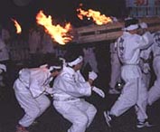 大松明を担いで巡拝するご神火祭(繞道祭=にょうどうさい)