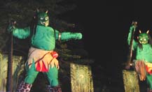 この青鬼まつりは、中興寛澄律師が鬼になって、仏法を守り、衆生を助けたことの故事に因む行事で、杉、松の葉で造られた大きな青鬼の像人形が飾られ、この前で鬼面をかぶったぬいぐるみの人が手に鉄棒をもってユーモラスに踊ります。撮影は自由にできますが、本堂などの一部で禁止されていますので、ご注意ください。