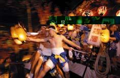 まず、トップは13日夕刻の民謡流しから始まります。約1300人の踊り子が与板おけさ、与板ばやしにのって、揃いのハッピや浴衣の連が競い合います。 翌14日は、みこし渡御があるほか、夕刻には松明走行や神楽があって、メインの登り屋台へと移ります。伝統ある行事で、宝暦7年(1757年)頃から続けられています。ワッショイ・ワッショイの掛け声とともに、町の中から都野神社の坂を走り抜けます。