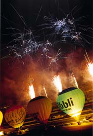大会の最終日の日没より、大会のフィナーレとして「バルーンイリュージョン」があります。音楽とシンクロして熱気球の炎と花火が競演を繰り広げる、幻想的な音と光のエンタテインメントです。競技に参加した気球とオフィシャル気球がスーパースピードウェイに一列にならび、合図とともにバーナーを点火。炎の光は球皮をランプシェードのように明るく照らし出します。スーパースピードウェイ中央のパドック、奥のロードコースからは花火が音楽とともに打ち上げられます。