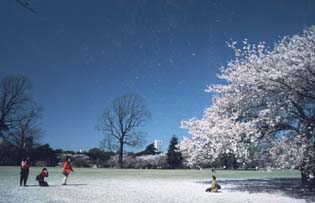 明治神宮に隣接するこの公園は、昭和39年の東京オリンピック選手村から代わったものです。園内にある桜はソメイヨシノが多く、中央広場からの眺めは壮観です。