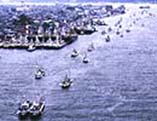 境港そして美保関の約100 艘の漁船がみこし・太鼓をのせて境水道をパレード。