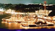 横須賀本港に浮かぶ日米艦船のイルミネーション点灯でスタート。カウントダウン終了と同時に、鮮やかなサーチライトが飛び交う中、洋上打上花火が新年を祝します。