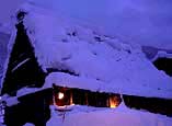 ライトアップされた家々を撮影するには、村営駐車場からつり橋を渡らなければなりません。この頃は、シャッターチャンスを求めて、人も多く降りしきる雪の中を歩かなければなりません。もっとも、ライトアップされると、幻想の世界が現れ、撮影のしがいがある場所です。