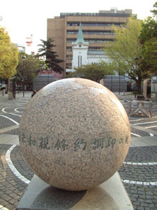 それでは、日本開国の現場は、横浜のどこにあるかというと、山下公園や大桟橋などの有名観光スポットにも近い、横浜開港資料館前の噴水がある広場のところ。この広場、「開港広場」というのですが、正式な名前を知っている人は、残念ながら、まだまだ少ないようです。近代日本の原点なのに、あまりにも注目されないので、かわいそうに思えてきますね。交差点に面した歩道付近に、地球儀型の記念碑が建っていて、日本開国という歴史の舞台であることを伝えています。