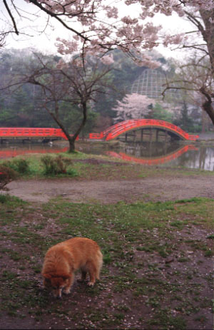 散歩の途中? 桜の木の下で雨宿りしている犬を撮りました。