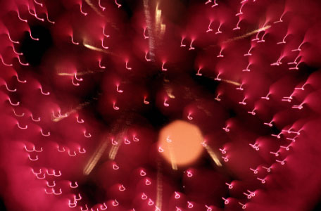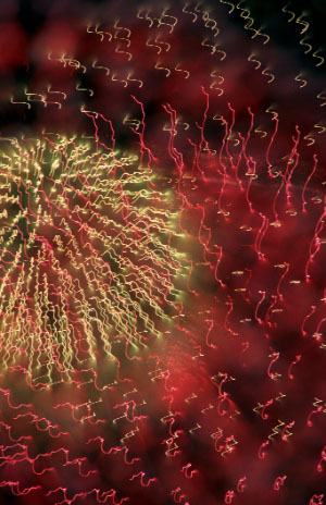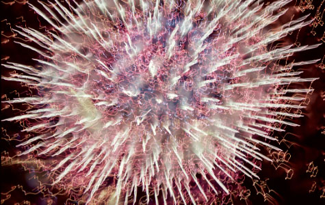 手持ちで打ち上げ花火を撮れば、必ず手ブレはするので、どうせブレるなら、いろいろと画面に“細工”をして、変わった表現方法を試してみるのも面白いでしょう。バルブで露光中に、レンズのピントを無限大から外してソフトフォーカスにしたり、ズームレンズなら焦点距離を変えて露光間ズームにしたり、同じ画面で2発の花火を多重露光するなど、いろいろなテクニックがあります。2つ以上のテクニックを組み合わせて撮るのも、斬新なイメージで良いかもしれません。どんな写真が撮れるかは、見てからのお楽しみということで、いろいろとチャレンジしてみてください。