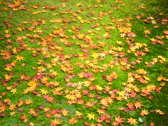 苔むした庭に、紅い葉の色を散りばめた光景は、繊細な造形の貼り絵か、あるいは美しい振り袖の着物を見ているようです。