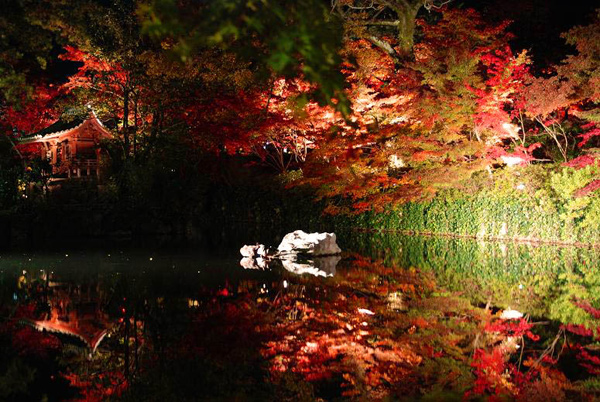 光が上のほうから当たる日中とは一味違った、舞台背景のような非日常のシーンが漆黒の空間に浮かんでいます。池に映った紅葉も見事ですね。