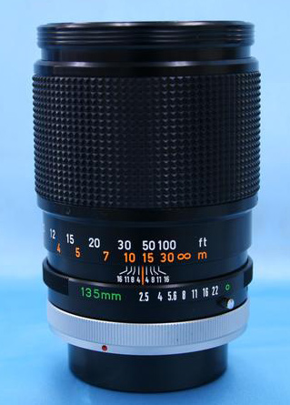 こちらは、ズームレンズが登場する以前には、お手軽な中望遠の代表格だった135mmレンズ。標準50mmレンズや広角20mmレンズと比較して、遠距離側の目盛りが細かくなっており、「∞」の手前の目盛りが、「30メートル」「15メートル」であることなどに大きな違いがあります。ちなみに、これより焦点距離の長い(ミリ数が大きい)超望遠レンズでは、さらに遠距離側の無限大に近い目盛りが細かくなります。これら3つのレンズを比べると、距離目盛りの付け方、つまりピントリングの回転角が、焦点距離によって大きく変化する傾向があることは明白でしょう。しかし、ズームレンズの場合は、こうした違いのある焦点距離を統合して共通の距離目盛りを付けるので、どうしても目盛りの刻みが大ざっぱになってしまいます。最近の一眼レフはAFが標準仕様なので、実際の撮影では、違和感を覚えることはまれですが、MFに切り替えて撮影することが多い場合、高倍率のズームレンズでは、望遠の遠距離側と、広角の近接側で、やや小回りが効きにくい印象を受けるかもしれません。
