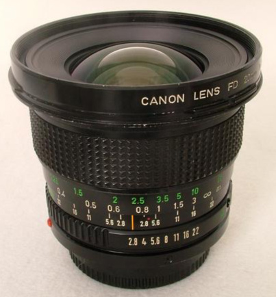 これは、被写体までの距離が同じ条件の場合に、より広い画角を得られる広角レンズ。焦点距離は20mmで、広角の中でも「超広角」といわれるタイプです。標準50mmレンズに対して、「∞」の1つ手前の距離目盛りが「3メートル」であることや、被写界深度を示す指標の間隔が広いことが特徴として挙げられます。最短撮影距離も、50mmレンズよりは短く、そのため1メートル以下の目盛りが細かくなっていることも大きな違いです。ピントリング上の目盛りで、「3メートル~∞」の幅よりも、「0.4~0.5メートル」の幅のほうが広いことなどにも注目してください。ただし、このくらいの近接撮影でも、ファインダーの見た目の画角が標準レンズより広くなるので、実際の撮影では、あまり近付いて撮っている気がしないかもしれません。広角レンズにおけるこの傾向は、焦点距離の数字が小さくなるほど強くなり、ピントの合う範囲はより広くなります。