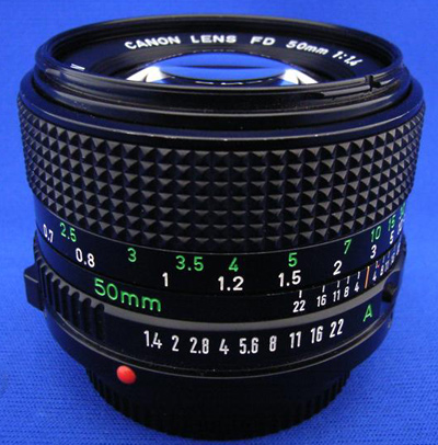 35ミリ判のフィルムを使用する一眼レフカメラの交換レンズでは、50mmのことを標準レンズといいます。人間の肉眼に近い画角で、画像の歪みや背景ボケなどにクセがなく、見た目通りに撮れることが特徴です。昔の一眼レフでは、ボディを購入すると、通例、この50mmレンズがセットされていました。ちなみに、F1.4は開放絞りが明るい高級レンズで、これより少し暗めで普及価格のレンズも発売されていました。