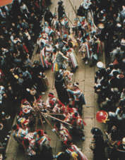 1隊、15名ほどが円陣を組み、この隊が7~10数組の列になって、太鼓のリズムに合わせ、棒をバレン振りと呼ばれる振り方で円舞する姿は勇壮です。見ていても楽しく、ついシャッターを押したくなります。