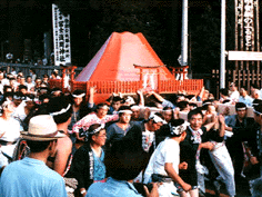 火祭りは8月26日の午後4時頃、大神輿と御影(おやまさんと呼ばれ、赤富士を模した重さ1トンの神輿)が浅間神社威勢よく出発し、町中を練り歩き、夕闇が迫る頃に、御旅所に奉安されます。御旅所へ到着同時に市中に立てられた直径90cm、高さ3mの大たいまつに、一斉に点火され、町中は火の海と化します。