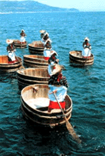 また、小木海岸では波と潮の加減で見えたり、隠れたりする岩礁が多く、その間を「たらい舟」が行き来します。ワカメ、サザエ、アワビ採りのために現在でも漁船として数多く利用されています。このたらい舟が考案されたのは明治の初期で、洗濯桶から改良に改良を重ねて、現在のたらい舟になったそうです。ちなみにたらい舟の材料は樹齢約60年の杉と長さ 10m以上の真竹、大きさは縦 180cm、横 140cm、深さ55cmとなっています。