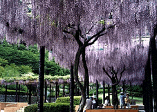 *岡山県和気町 名勝芳嵐園・藤公園= 和気神社(和気清麻呂公いわれの神社)外苑として清流日笠川に沿う= 1.5万平米の公園 藤棚面積3600平米の藤棚 日本一の声も 4月29日に藤祭= JR山陽本線和気駅からタクシー 1,000円前後