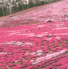 それはともかく、シバザクラが咲いている滝上公園は面積10万平米といいますから、ちょっと想像もつかない広さです。また、公園自体が丘陵になっており、園内の一番高いところでは400mを超えています。その斜面にシバザクラが文字通り、ジュウタンを敷き詰めたように染め上げます。花の色は白がところどころに咲いていますが、ほとんどが赤に近いピンクと薄いピンクで覆われています。広大なスケールは北海道ならではの景観といえ、このシバザクラは真夏に咲く富良野地方のラベンダーと並んで、双璧と言えるでしょう。