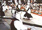 東が早いと、近江の勝ち、西が早いと、丹波を勝ちとしていますが、最近はそうした地域の競争よりも全体の五穀豊穣を祈願するムードが高くなった感じがします。この竹伐り会のいわれは平安時代に峰延〔ほうえん〕和尚(または峯延〔ぶえん〕上人ともいわれています)が、里人に害を与えていた雌雄の大蛇を退治し、蛇は法に服したのでこれを許して「この山は水に乏しいので水を与えよ」と命じて放したところ、以来、山に清水が湧くようになったともいわれています。