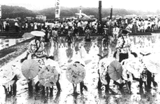 人口1万人にも満たない小さな町の田植祭りですが、そのいわれは約2千年前に逆上ります。地主が天照大神の供物を探しているときに、鶴が見事な稲穂を落としたそうで、これがおこりになって磯部の御神田ができたそうです。その地主によって天照大神(あまてらすおおみのかみ)を祀ったお宮を建てられたのが伊雑宮(伊勢神宮の別宮)といわれていますから、歴史的に見ても日本三大田植え祭りのひとつに挙げられても「納得」しますね。もっとも祭りそのものが文献にあらわれたのが南北朝時代(1330年頃)になってからのこと。祭りの由来はやはり豊作祈願、吉凶を占う、重労働に対しての「うさ晴らし」のようです。また、明治時代に神宮改革で中断されましたが、地元住民が虫除け祈願として復興させたいわれもあります。