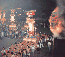 8日夜、神輿とキリコが海岸に集まったあと八坂神社に向かいます。その途中が凄い、神輿を海中に投げ込んだり、火中にぶん投げたりと、神輿の原型がなくなるほどぶち壊します。火の粉が舞、水しぶきが飛びかい、その中を鉦、太鼓の音、男の雄叫びが入り交じります。