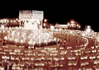 山鹿灯籠は、和紙とのりだけで金灯篭や神社仏閣などを作る伝統的な工芸品ですが、祭りの圧巻は浴衣姿の女性が和紙で作った金灯篭(中に火が灯っています)を頭にのせて「よへほ節」を踊る光景でしょう。宵闇が迫る頃ともなると灯籠が幻想的な世界へ導いてくれます。
