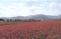 このような群生した花を撮影する場合のポイントは、やはりアングルです。つい高い位置から撮りたい心境になりますが、花だけの写真では意外に迫力がありません。背景選びが重要です。ラッキョの花自体は高さが30cm程度ですから、背景に山を配したりするには、むしろ屈み腰になります。それと、遠景までを取り入れようとするなら、レンズの絞りを小さくしますので、シャッタースピードが遅くなりカメラぶれが生じますので、三脚は必携です。