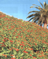 このポインセチアはクリスマスの花としてシンボル的に親しまれていますが、正確には赤くなっている部分は花ではなく、枝の先の葉が赤く染まっているのです。宮崎市の堀切峠(ほりきりとうげ)で、今を盛りと赤く咲いています。堀切峠からは洗濯岩(板)で有名な青島やそれを取り巻く白波と紺碧の海の景観が素晴らしいところです。峠の頂上から若干下がった南側に位置するフェニックスドライブンインを中心に、海に向かっての斜面に5万本が植えられ、群生しています。そのドライブインの方にうかがいますと「霜が下りるまで大丈夫」とのことで、その霜がいつ来るか分かりませんが、20日から天皇誕生日の23日ぐらいまでが丁度、見頃だそうです。南国の植物、フェニックスと赤いポインセチアの群落、そして素晴らしい景観が訪れる人を酔わせてくれること受けあいです。