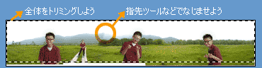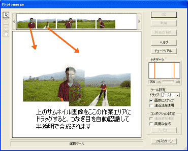 | パノラマ画像合成ソフトは、いろいろな種類があり(デジタルカメラにバンドルされている「PanoramaMaker(Arcsoft)」など)、ほとんどはソフトの自動合成機能を使ってカンタンに合成できます。ですが、今回はカスタム合成にも便利な PhotoshopElements(Adobe) を使用してパノラマ画像を作ってみましょう。 | ||