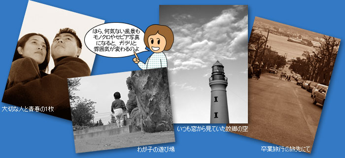 | 3月は移動の季節。入学や就職、転勤などで今までの生活に別れを告げる人も多いと思います。そこで、今回のテーマは「思い出」。えっ?写真そのものが思い出じゃないかって?まぁ、そうなのですが、ここでは、思い出として残したいものを何気なく写真に撮り、それをモノクロやセピア写真にする方法をご紹介します。 | ||