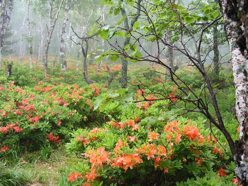 | 手前に写っているレンゲツツジが鮮やかでキレイ!緑の美しさや、森の奥へとつづく白樺林の雰囲気が何だかロマンチックです。右手前に写りこんでいる枝がもう少し小ぶりのものだとスッキリするのかなぁ?という気がしましたが、これが効果的に奥行き感を表現しているんですね。 |