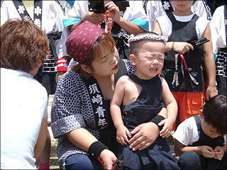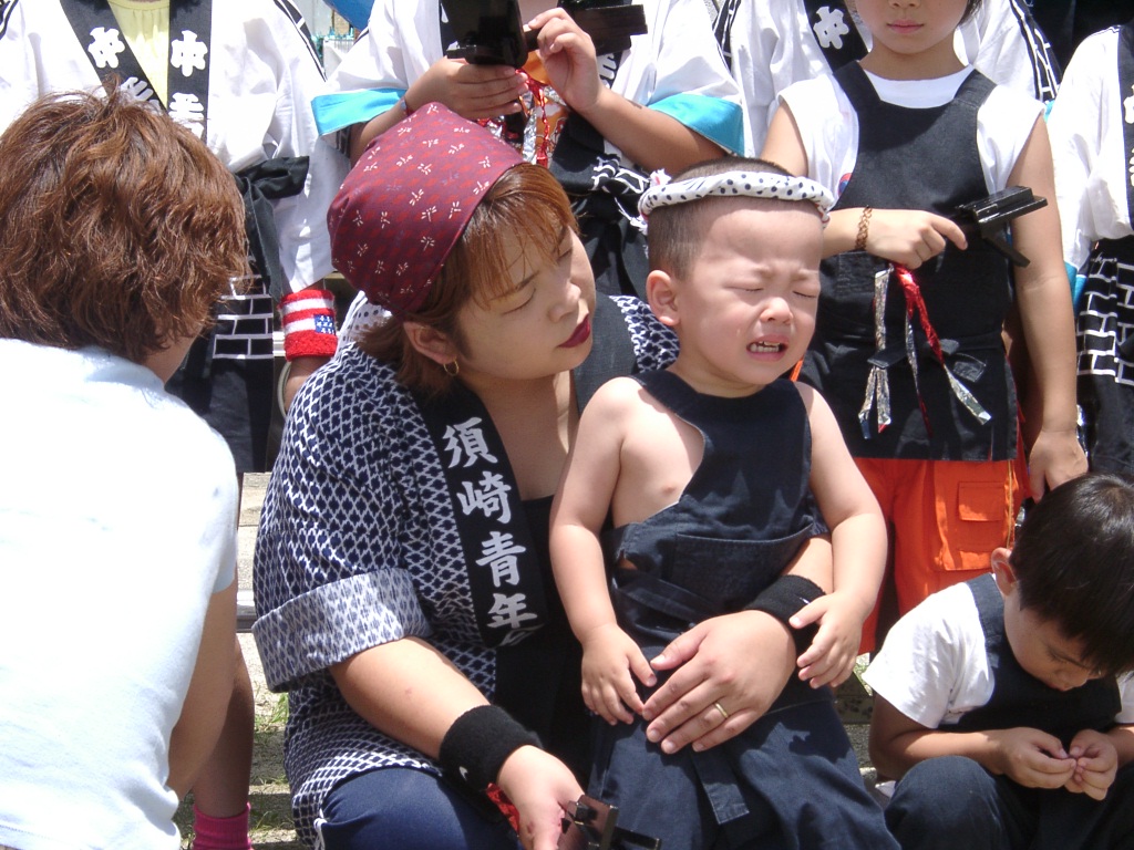 はじめて2歳7ヶ月の息子が「なるこおどり」に参加しました。叔母に励まされ、泣きながらの記念写真。暑い日でしたが、息子は最後まで踊ることが出来ました。いえ、踊ると言うより、顔をしかめながら頑張って歩いたと言う表現が正しいかも。