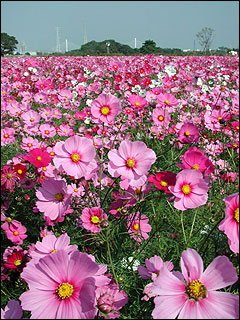 | 昨年の秋のコスモス畑のワンシーン。驚くことに、すべてのコスモスがお日様に向かって咲いていました。 |