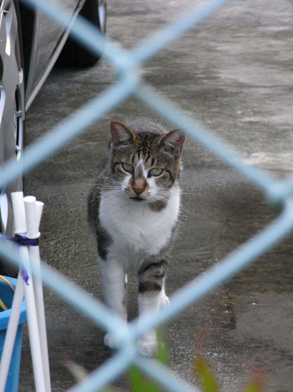 警戒した猫が逃げないよう、カメラを構えるときはゆっくりと。作例は金網の間に猫が入るアングルを探し金網越しに撮影した。