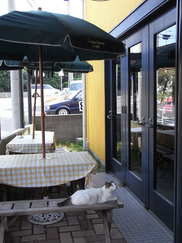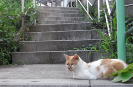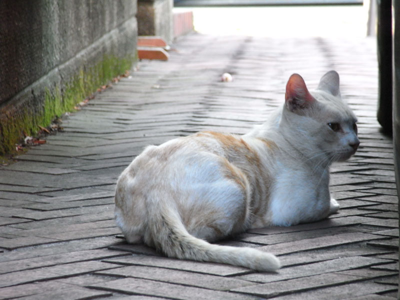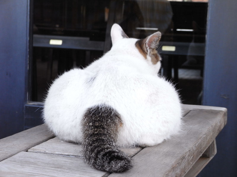 猫の視線までしゃがみこみ、ズームを引くことで背景を写真に写しこむ。意図的に背景を入れることで、猫ののんびりした生活や時間のゆったり感が表現できる。