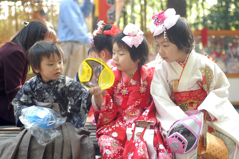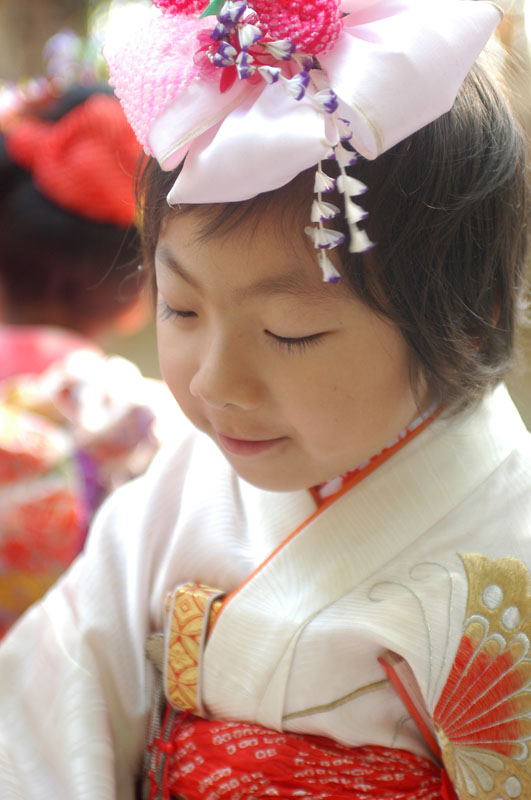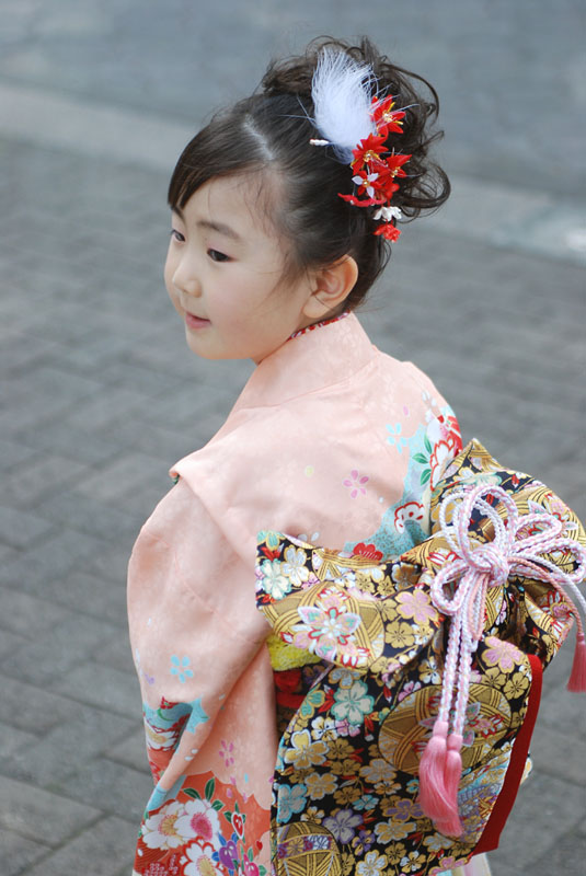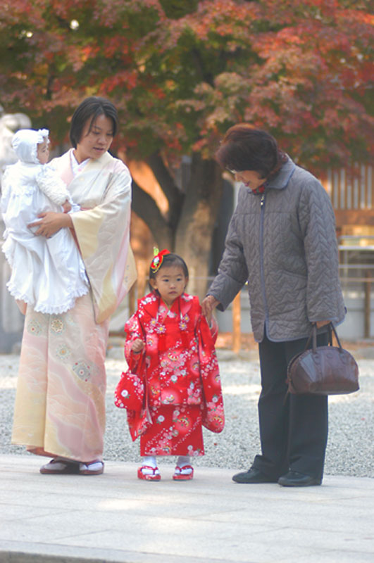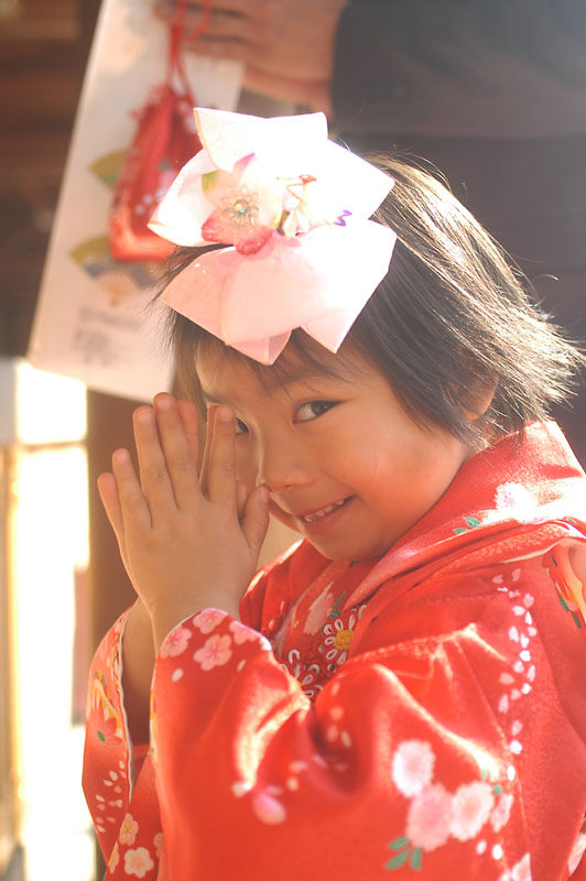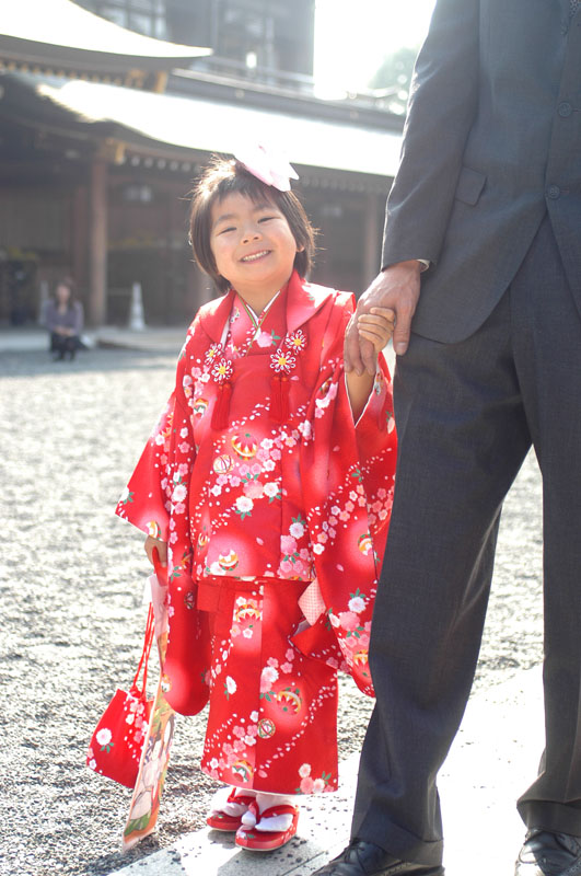 かなり混雑した大きな神社の境内だったが、人が少ない場所を背景に選んだ。晴天の昼間なので、着物と子どもの表情をきれいに撮るため逆光で撮影。