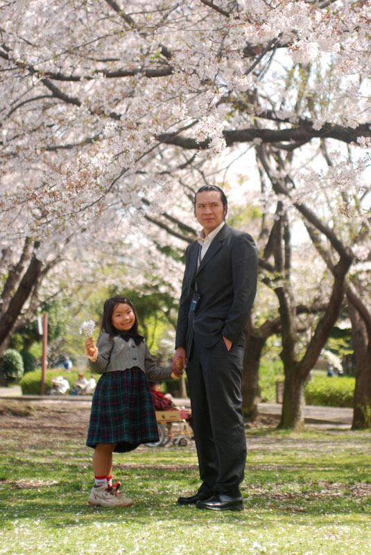桜と一緒に写真を撮るために、帰りに近所の公園に寄って撮りました。背景の桜を画面いっぱいに見せたかったので望遠で遠くから撮りました。