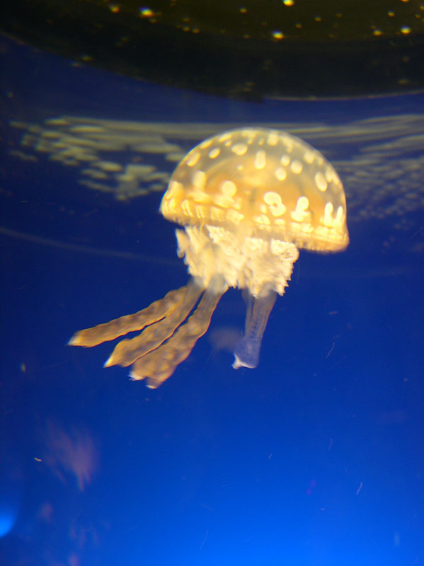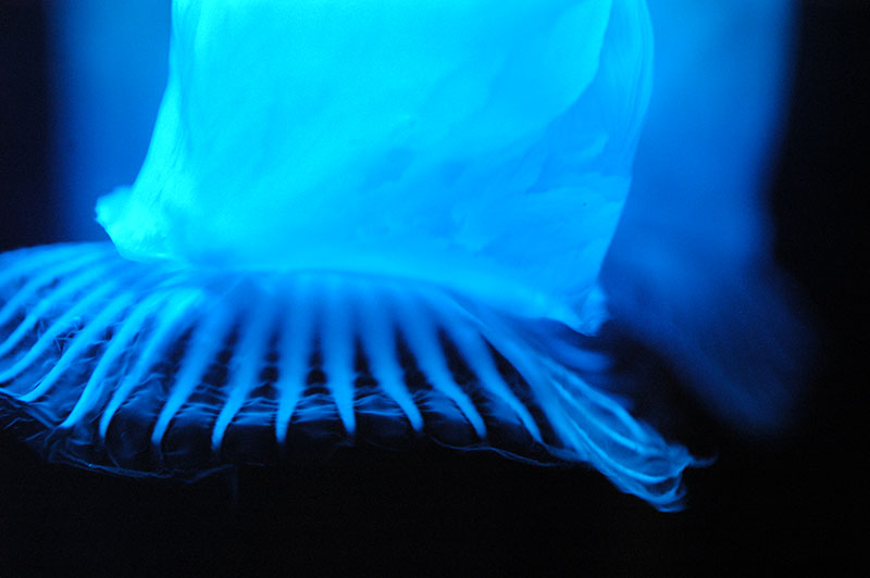 暗いくらげの水槽で、下から青いライトでライトアップされています。動きの遅いくらげの水槽を選びアップにするために、手前側にいるくらげをねらいました。