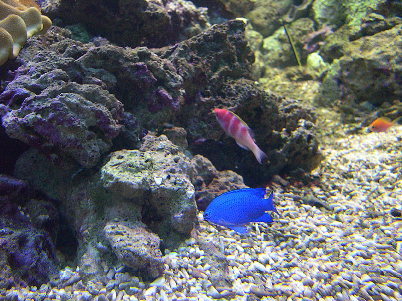 たいていのコンパクトデジカメは望遠にするほど暗く写るようになっている。そのため被写体を大きく写したいときは、ズームを使わずに水槽に近づいて撮るとよい。