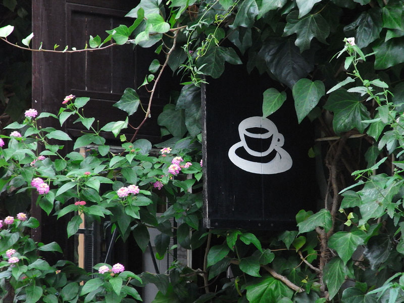 黒塗りの看板と印象的な白いイラストを撮影。白は、暗い色の中にあるとよりいっそう際立つため、黒や濃い緑でフレーミングしわざと露出をマイナス補正して周りを暗く落として撮影した。