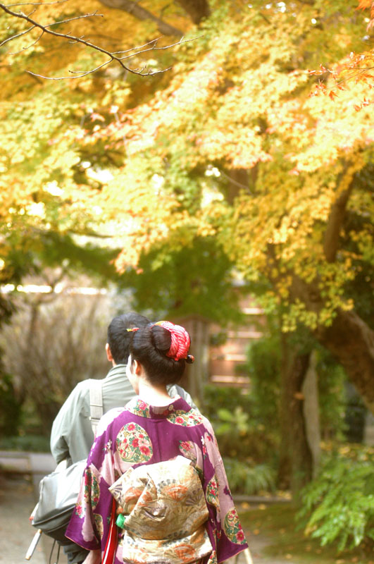 紅葉の写真を撮っていたら、和装の女性が通りかかるのを発見。ズームを望遠にして通り過ぎるのを待ち、紅葉の前を女性が差し掛かる瞬間をねらってシャッターを切った。