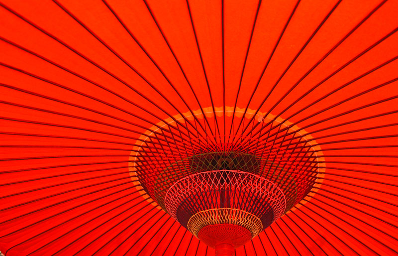 画面全体で赤い傘を撮り放射線構図でまとめる