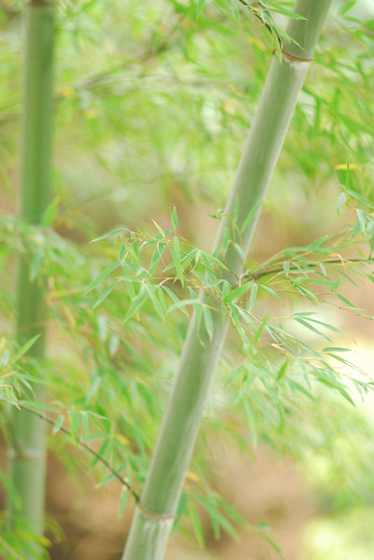 たくさんの同じものの中からひとつだけを切り取ってスポットをあてるように撮影することによって、その奥深さを想像させる撮り方ができる。写真は望遠で撮ったため、竹の奥につながる竹林がぼやけて幻想的な雰囲気に。切り取った竹を斜めに、中心には笹の葉を入れてアクセントにしている。