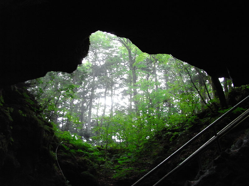 洞窟の入り口を中から見上げて撮影。洞窟の入り口はシルエットにして外の木立に露出を合わせる。オートのままだと手前が真っ暗になり、洞窟の入り口ということがわからなくなるので、その様子がわかるくらいにマイナスに補正する。