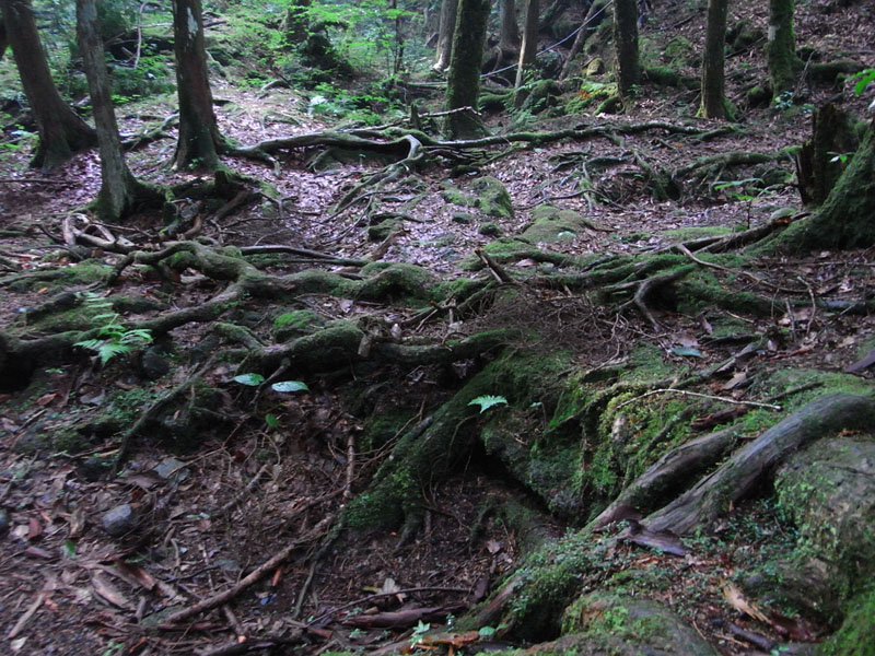 その場の雰囲気を活かす色を大切にする。ここでは、露出して絡み合った木の根をフレーミングすることで、不気味さを強調。また、樹海の薄暗さを出すために、露出をマイナス補正した。
